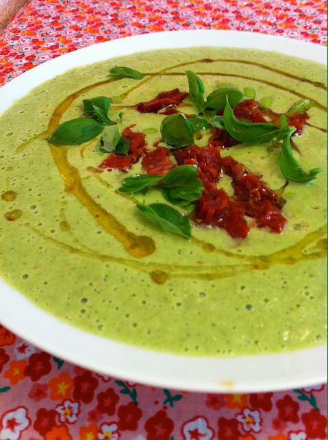 Blend all the ingredients together well until smooth and creamy, eat immediately whilst still warm. To reheat, simmer on a low temperature, in a saucepan until warm to not bring to the boil. Garnish with sundried tomatoes and fresh basil or herbs of your choice. Drizzle with flaxoil or olive oil.